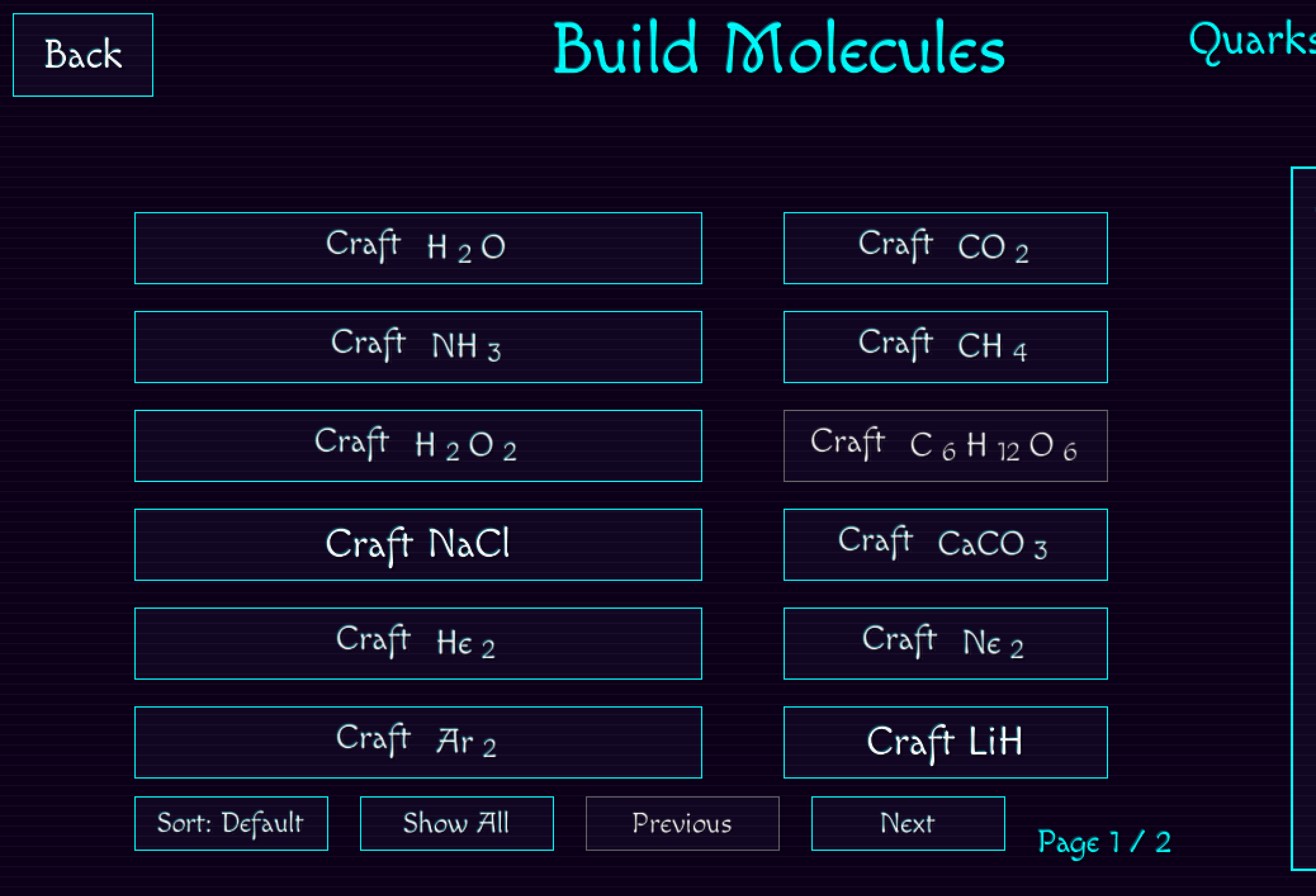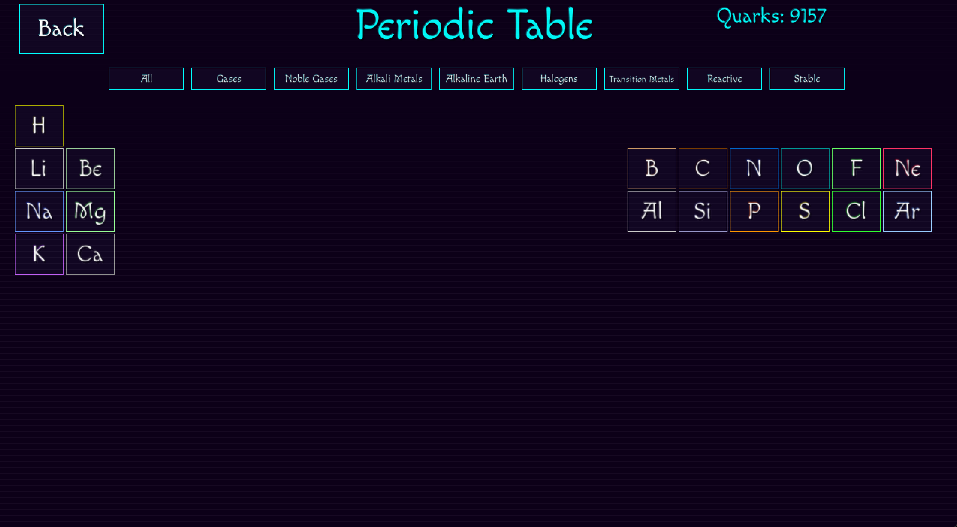 the fundamental building blocks of matter. Click to generate your first quarks, then use them to unlock elements from the periodic table. As your collection grows, combine elements into molecules, purchase powerful upgrades, and unlock achievements as you master the chemistry of creation!